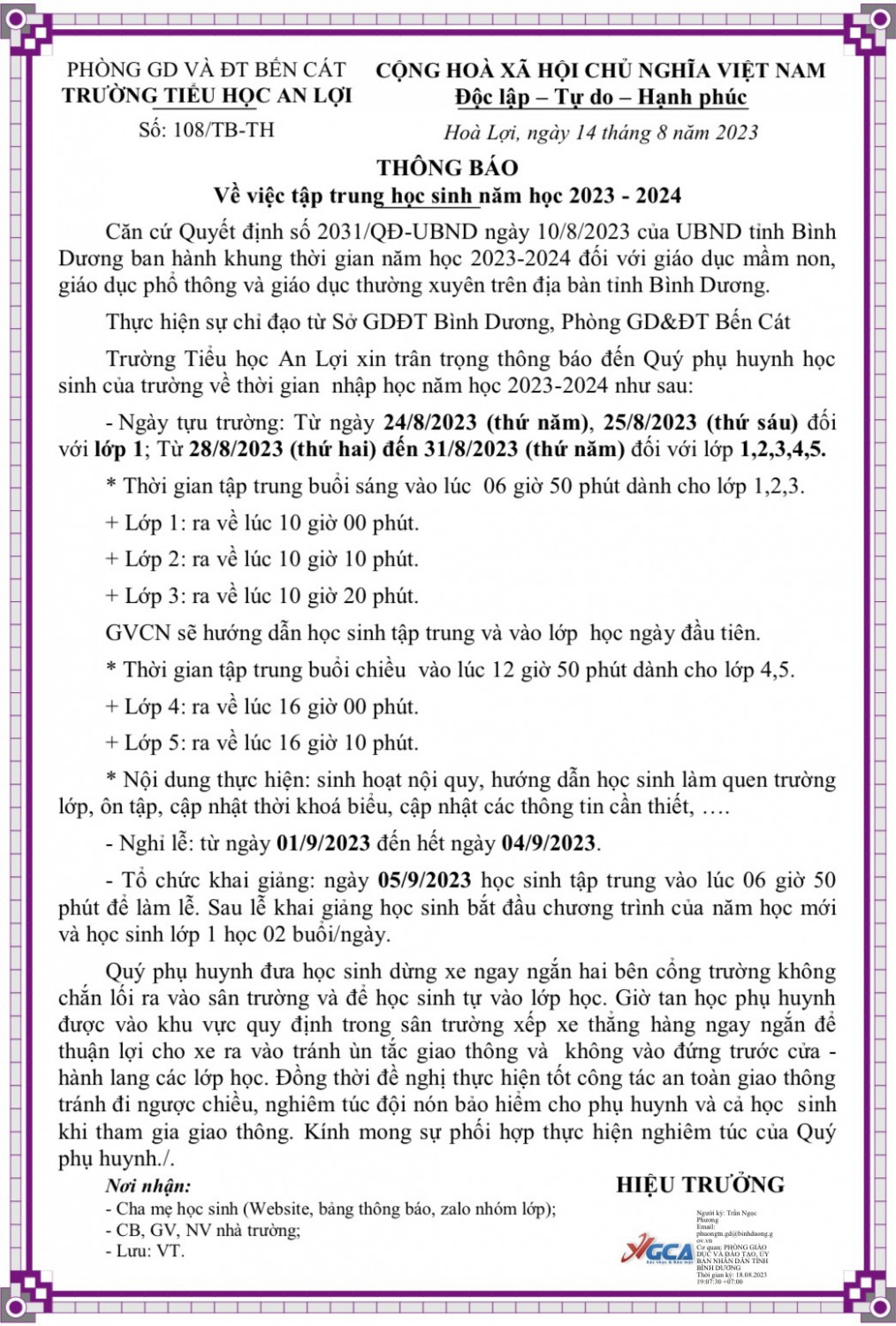THỜI GIAN NHẬP HỌC NĂM HỌC 2023-2024