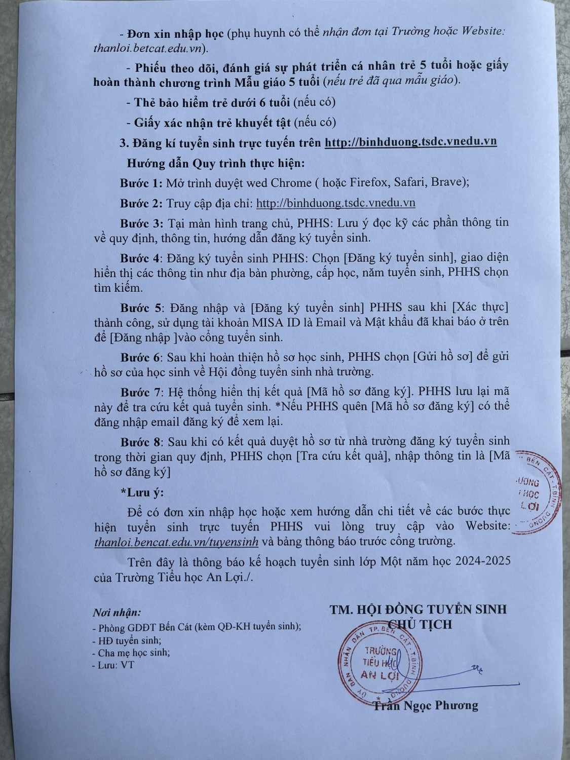 Để có đơn xin nhập học hoặc xem hướng dẫn chi tiết về các bước thực hiện tuyển sinh trực tuyến PHHS vui lòng truy cập vào Website: thanloi.bencat.edu.vn/tuyensinh và bảng thông báo trước cổng trường.